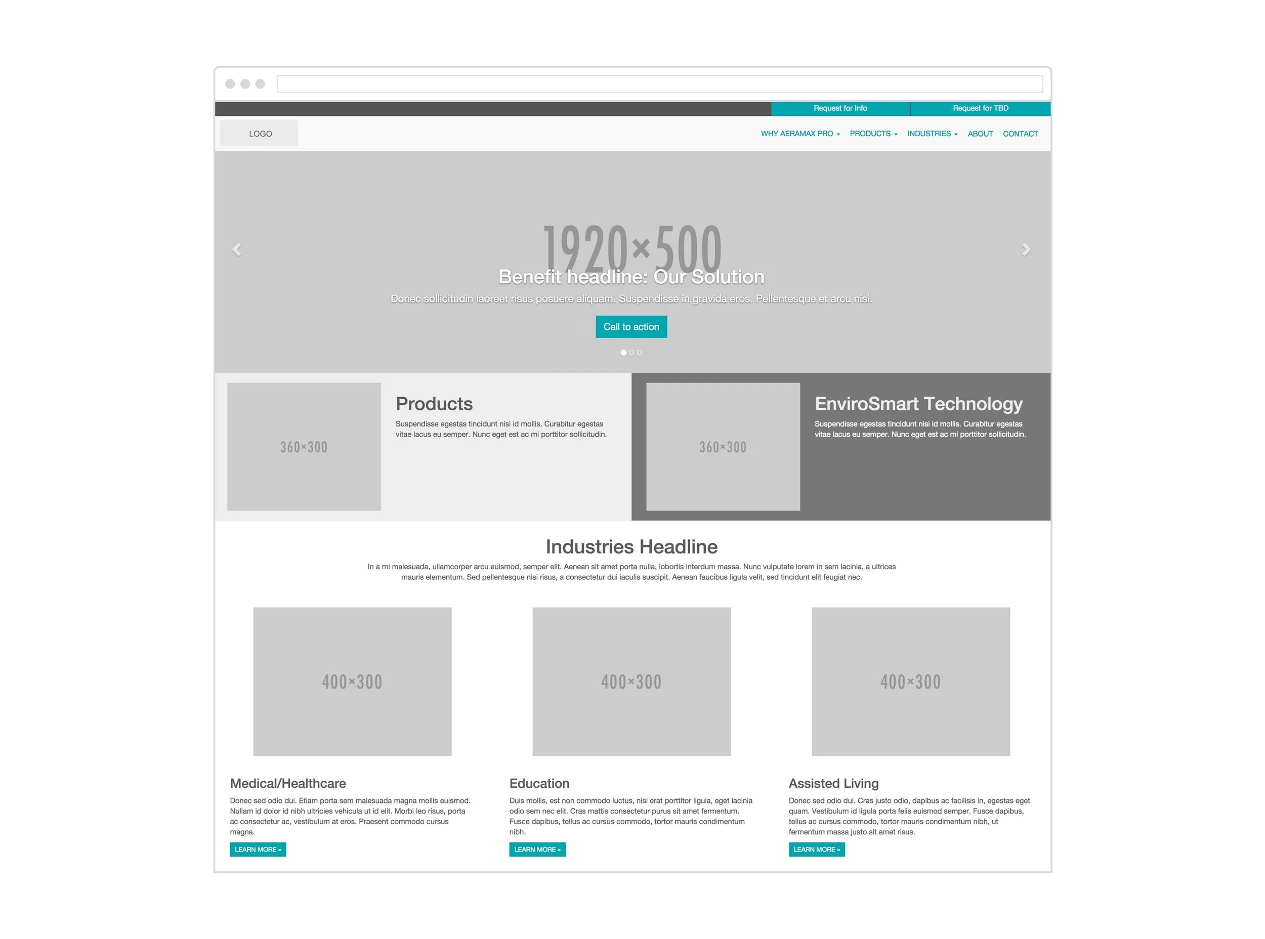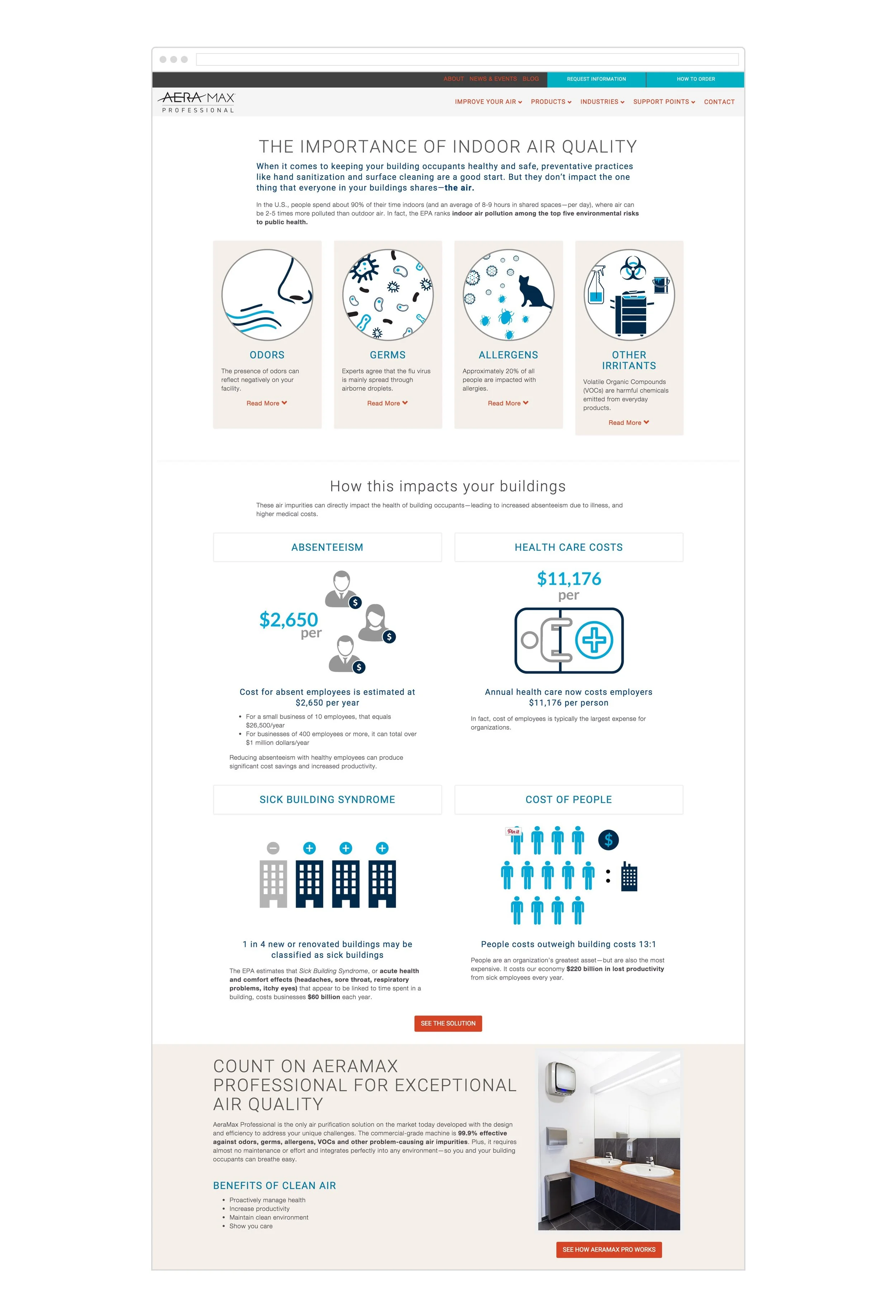 Some users may be unfamiliar with or unaware of the value of the product. The old site did not do a good job of connecting the value of the product to both the user and his/her business. Longer scrolling pages set up the problem of air quality using infographics that highlight concerns at a glance. The benefit-driven story positions the product as solution.